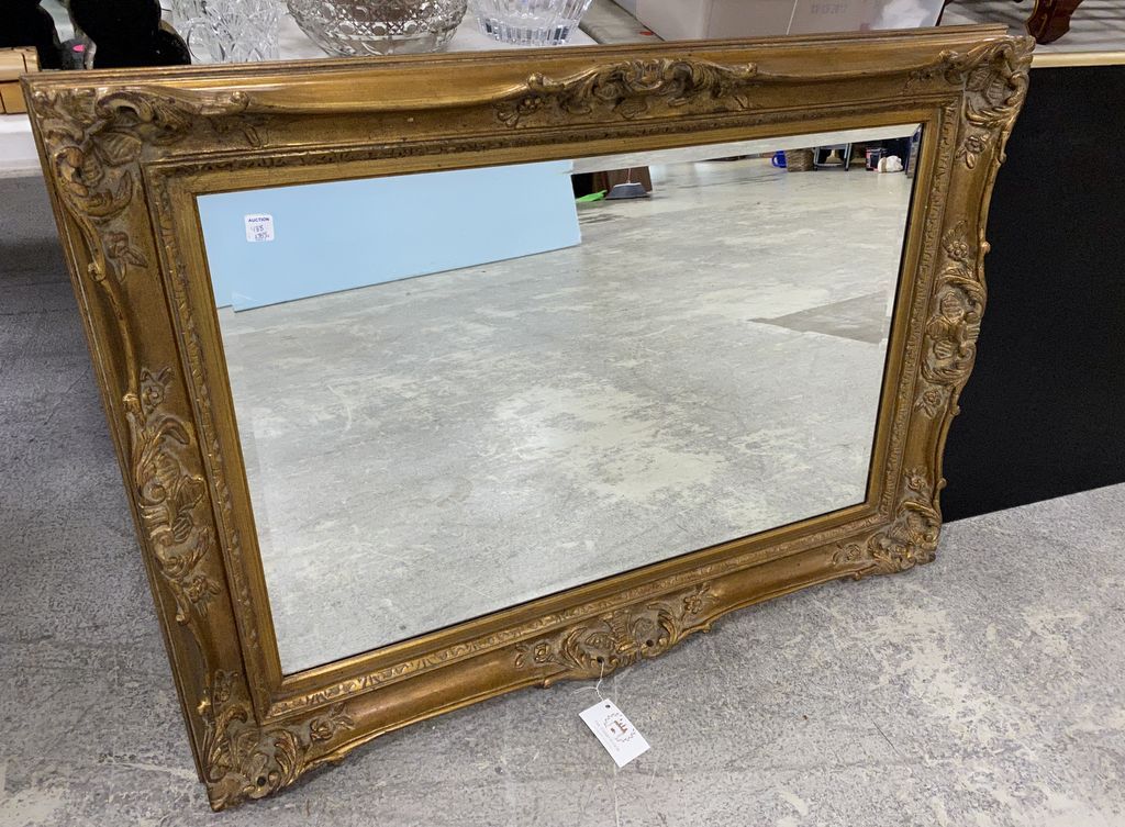 Reproduction Gold Gilt Wall Mirror, beveled, ornate design, good condition, 33"h., 44"w. Reproduction Gold Gilt Wall Mirror, beveled, ornate design, good condition, 33"h., 44"w.