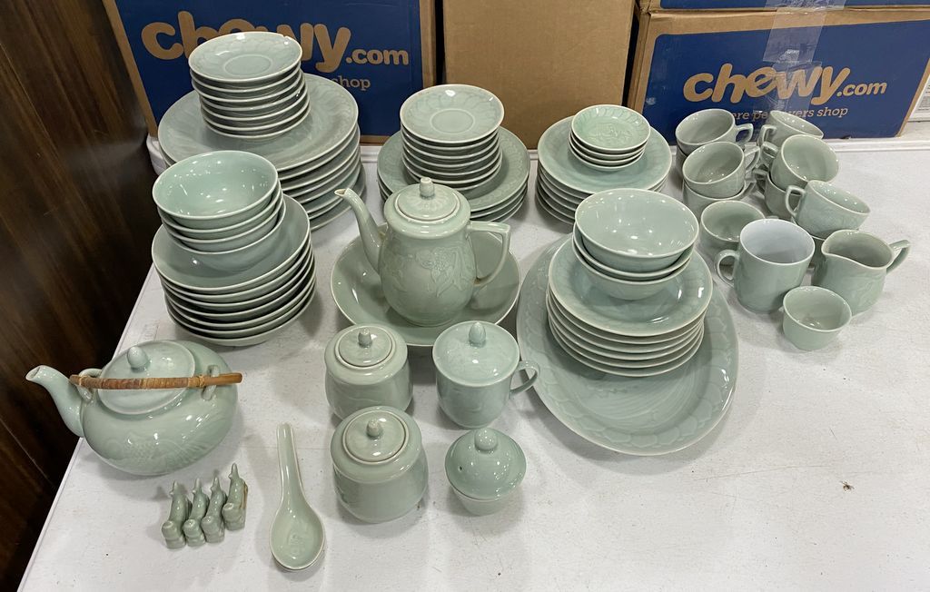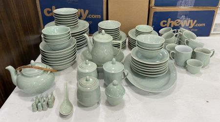 Chinese Porcelain China Set, green, 8 dinner plates, 4 salad plates, 6 bread & butter, 7 bowls, platter, serving bowl, tea pot, pitcher, 14 saucers, sugar, spoon, cups. Chinese Porcelain China Set, green, 8 dinner plates, 4 salad plates, 6 bread & butter, 7 bowls, platter, serving bowl, tea pot, pitcher, 14 saucers, sugar, spoon, cups.