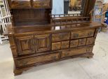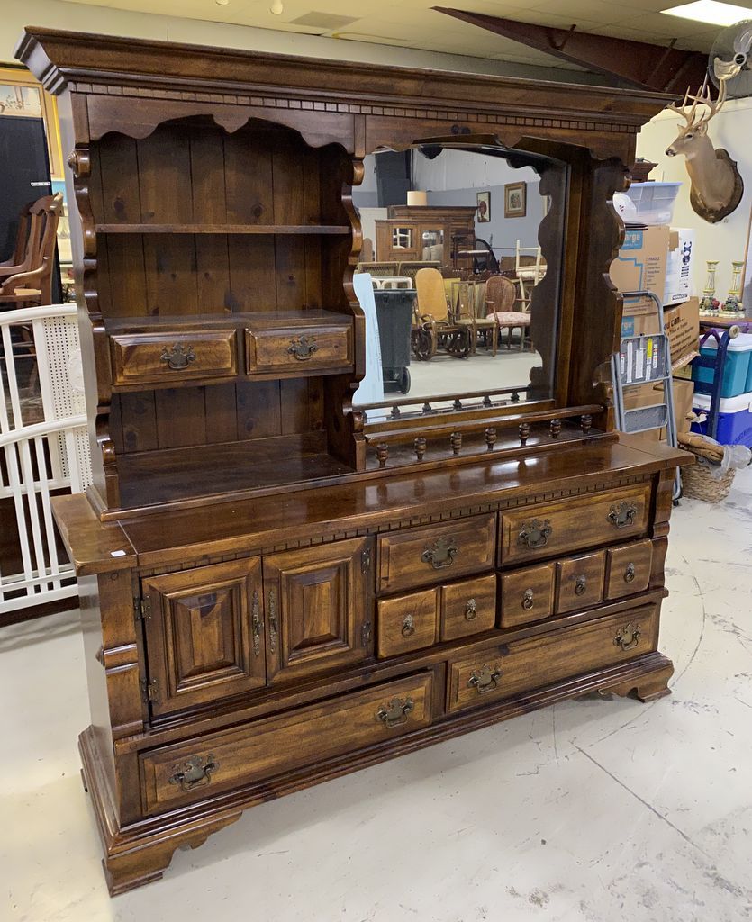 Large 1970's-80's Double Dresser, two piece with hutch mirror top, speckled wood finish, 8 drawers, double door, light wear, 75"h., 72"w., 19"d. Large 1970's-80's Double Dresser, two piece with hutch mirror top, speckled wood finish, 8 drawers, double door, light wear, 75"h., 72"w., 19"d.