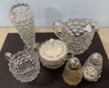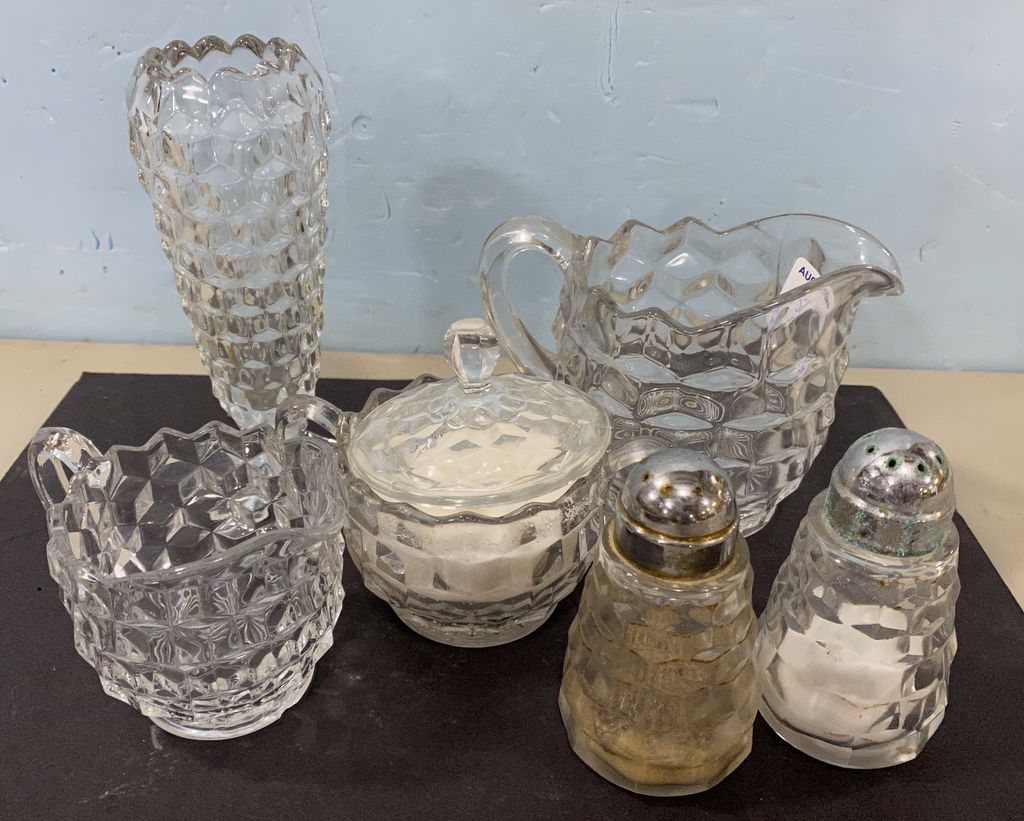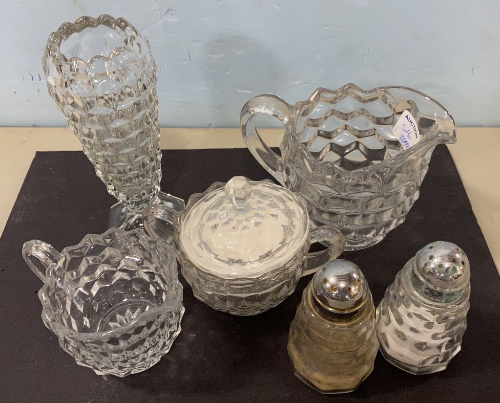 Group of Fostoria Serving Pieces, bud vase, creamer, sugar, creamer, and salt & pepper shakers. Group of Fostoria Serving Pieces, bud vase, creamer, sugar, creamer, and salt & pepper shakers.