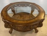 Modern Italian Style Round Coffee Table, reproduction, two tier, glass inset top, ornate designs, good condition, 20"h., 42"w. Modern Italian Style Round Coffee Table, reproduction, two tier, glass inset top, ornate designs, good condition, 20"h., 42"w.