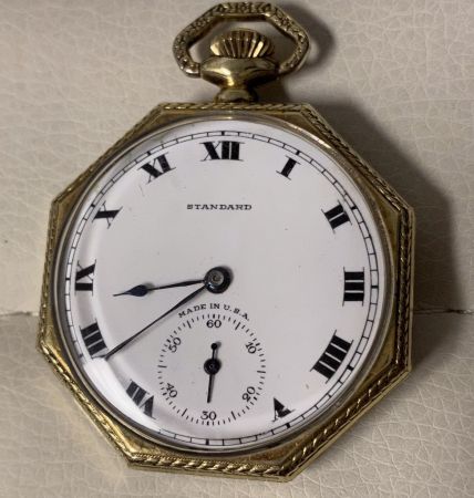 New York Standard Open Face Watch, 15 jewels, marked S.W.C.C.O. Scepter, FF132722, needs work, will run but stops, good condition. New York Standard Open Face Watch, 15 jewels, marked S.W.C.C.O. Scepter, FF132722, needs work, will run but stops, good condition.