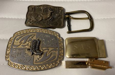 Group of Belt Buckles, Cowboy Belt buckle, Brass Deer buckle, SAS monogrammed brass buckle, and Brass belt buckle. Group of Belt Buckles, Cowboy Belt buckle, Brass Deer buckle, SAS monogrammed brass buckle, and Brass belt buckle.