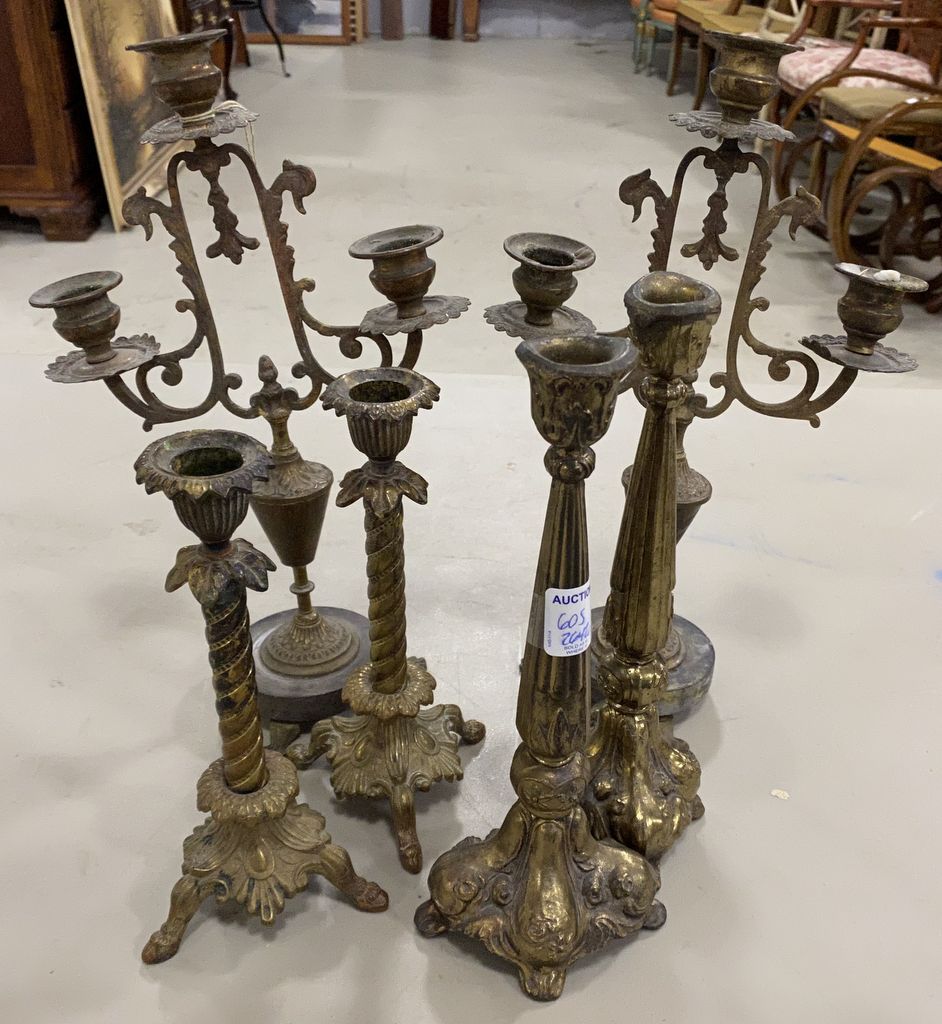 Group of Vintage Brass Candle Holders, one pair of three slot candle holders, one needs tightening, Two pair of brass candle holders, 10"h. Group of Vintage Brass Candle Holders, one pair of three slot candle holders, one needs tightening, Two pair of brass candle holders, 10"h.