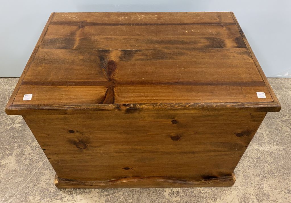Modern Pine storage chest, lift top, one hinge is damage, corner base wear, handled, 24"h., 34"w., 23"d. Modern Pine storage chest, lift top, one hinge is damage, corner base wear, handled, 24"h., 34"w., 23"d.