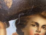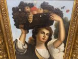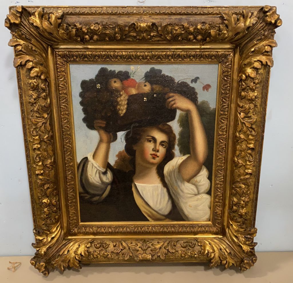 Antique Portrait Painting of Lady and Fruit Basket, canvas on Masonite, antique gold gilt framed, has scratches on center canvas, 32"h., 28"w. Antique Portrait Painting of Lady and Fruit Basket, canvas on Masonite, antique gold gilt framed, has scratches on center canvas, 32"h., 28"w.