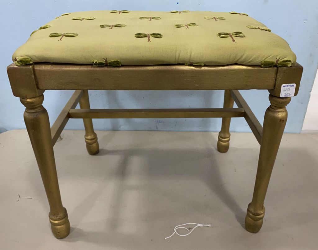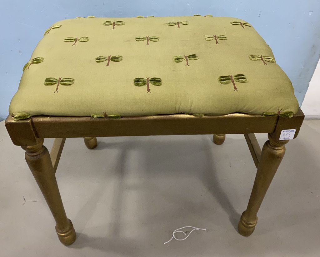 Painted Dragonfly Stool, dragonfly fabric cushion, gold gilt, 18"h., 20"w. Painted Dragonfly Stool, dragonfly fabric cushion, gold gilt, 18"h., 20"w.