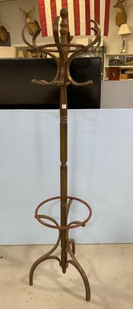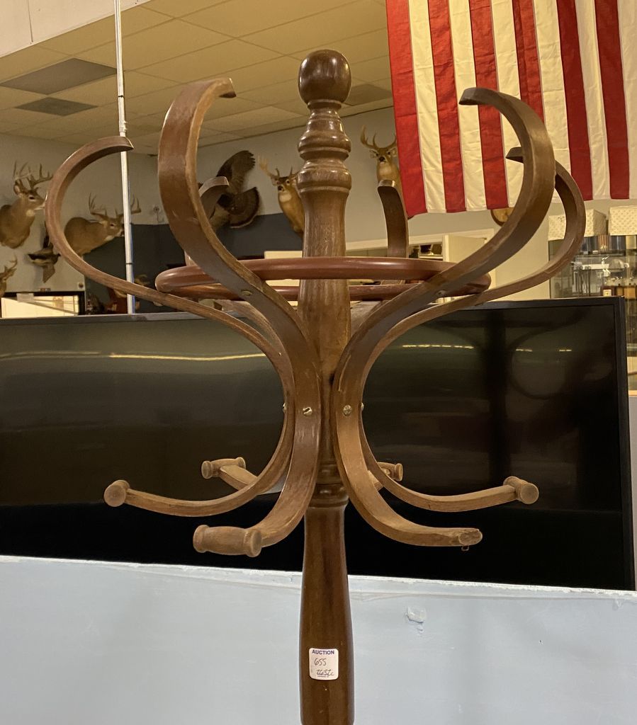 Cherry coat rack, reproduction, with umbrella holder, swivel top, needs some work, 73"h. Cherry coat rack, reproduction, with umbrella holder, swivel top, needs some work, 73"h.