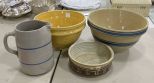 Group of stoneware pottery, blue label bowl, orange pottery bowl, blue label pitcher, 8"h. Group of stoneware pottery, blue label bowl, orange pottery bowl, blue label pitcher, 8"h.