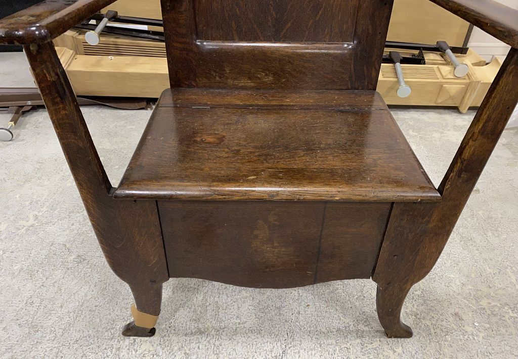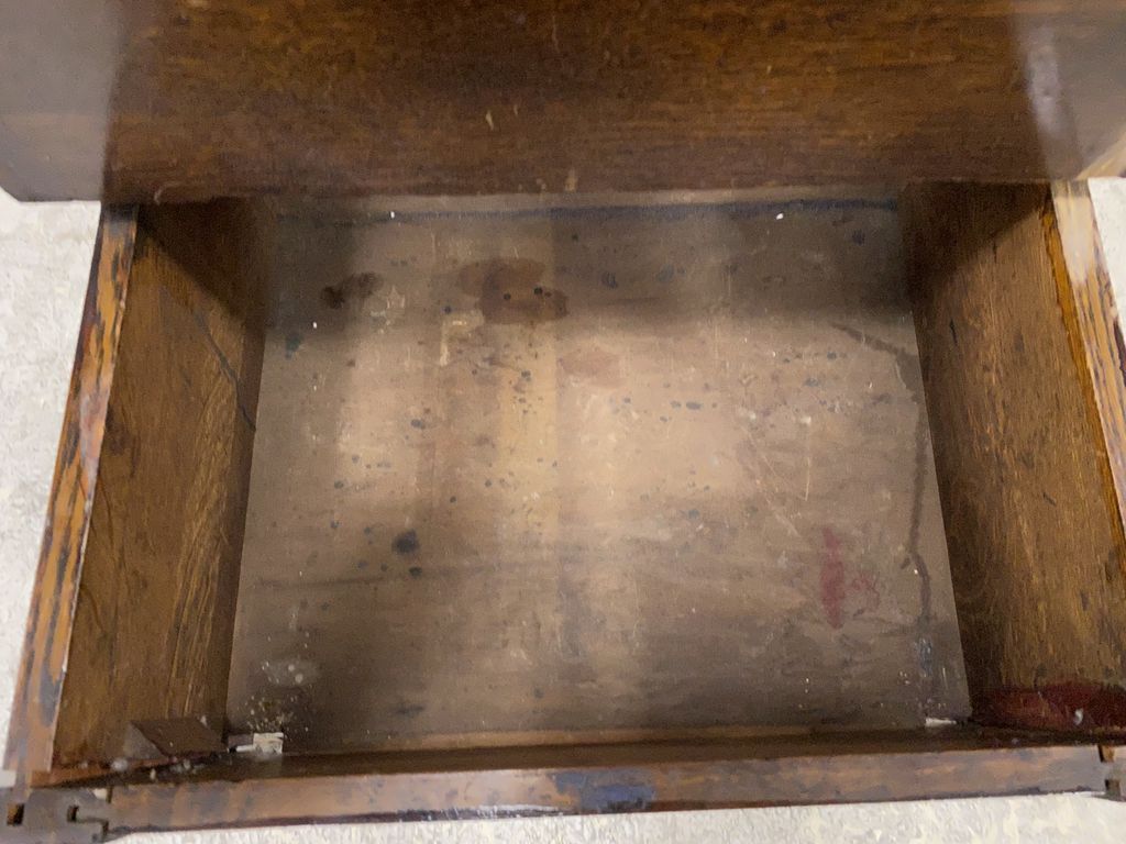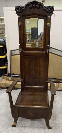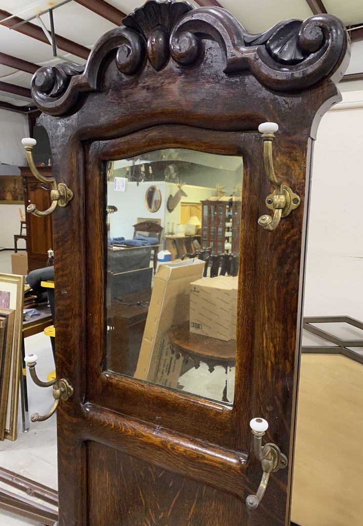 Antique Oak Hall Tree, four brass hooks, back beveled mirror, carved crest, damaged foot, needs work, 74"h. Antique Oak Hall Tree, four brass hooks, back beveled mirror, carved crest, damaged foot, needs work, 74"h.