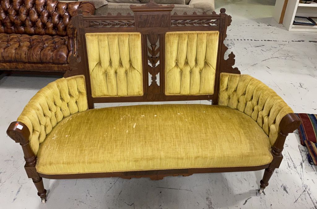 Antique Victorian Style Walnut Settee, carved, on casters, button tufted fabric, some some stains, 59"long. Antique Victorian Style Walnut Settee, carved, on casters, button tufted fabric, some some stains, 59"long.