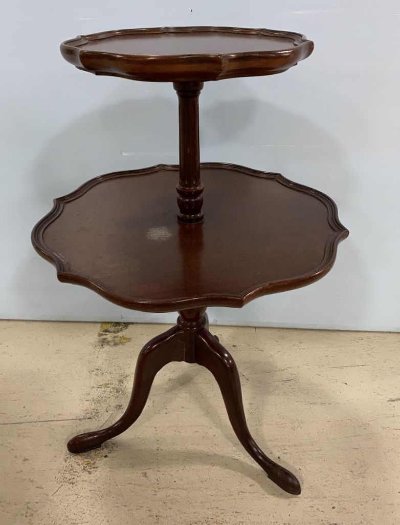 Queen Anne Two Tier Table, late 20th Century, pedestal base three footed, has light finish wear, mahogany, 29"h. Queen Anne Two Tier Table, late 20th Century, pedestal base three footed, has light finish wear, mahogany, 29"h.