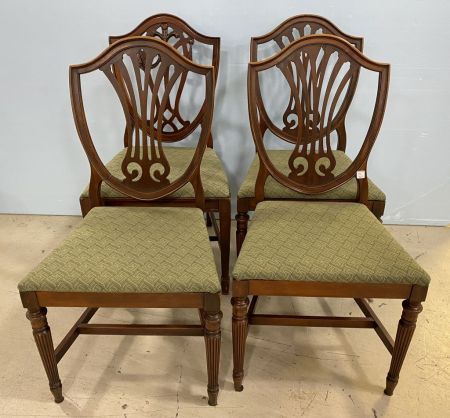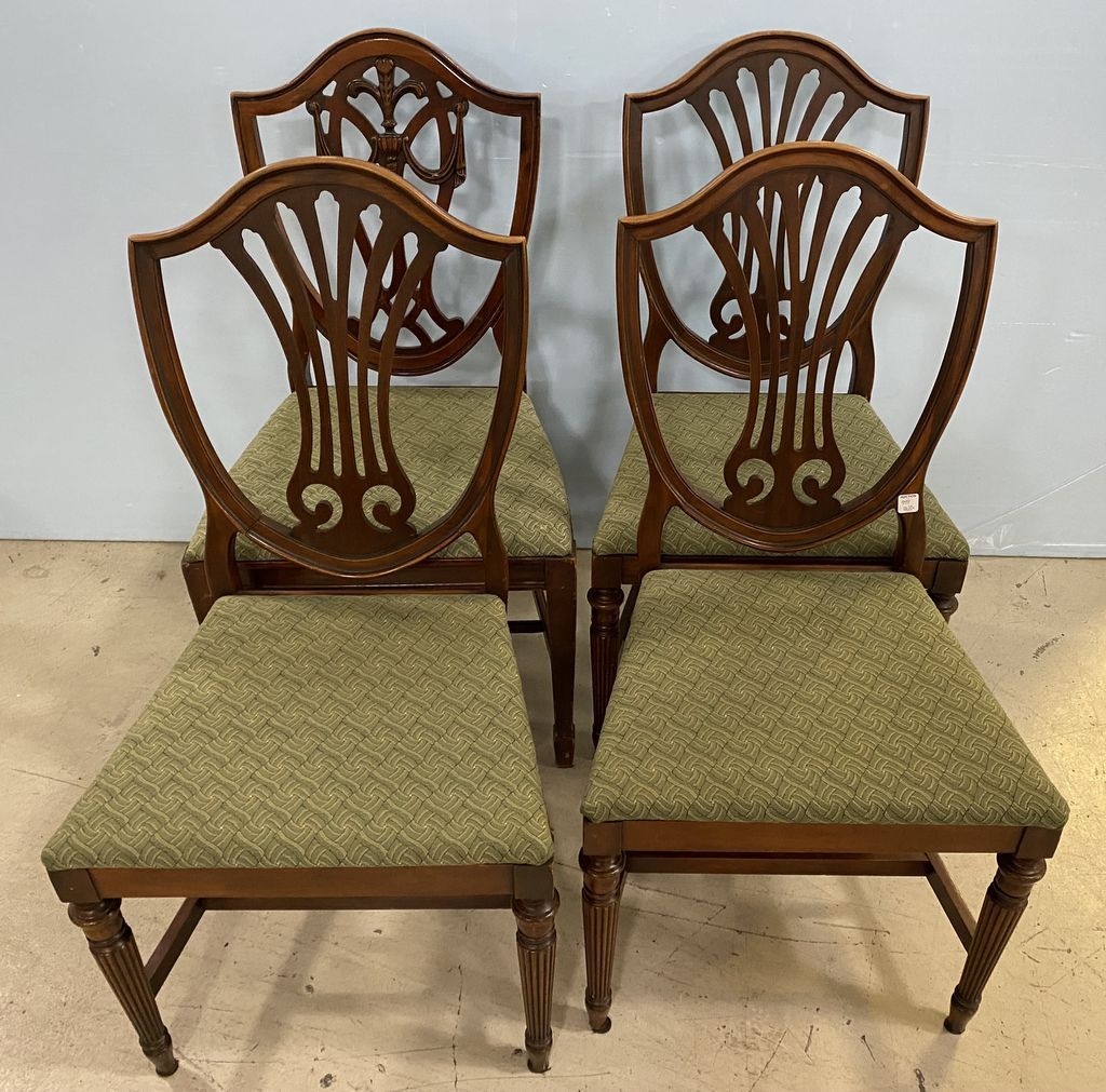 Four Sheraton Style Shield Back Dining Chairs, mahogany, clean fabric cushions, good condition. Four Sheraton Style Shield Back Dining Chairs, mahogany, clean fabric cushions, good condition.