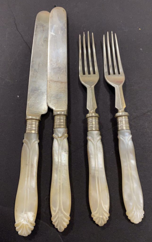 Four Silver Plate Knives and Forks, pearl handled, one with crack. Four Silver Plate Knives and Forks, pearl handled, one with crack.