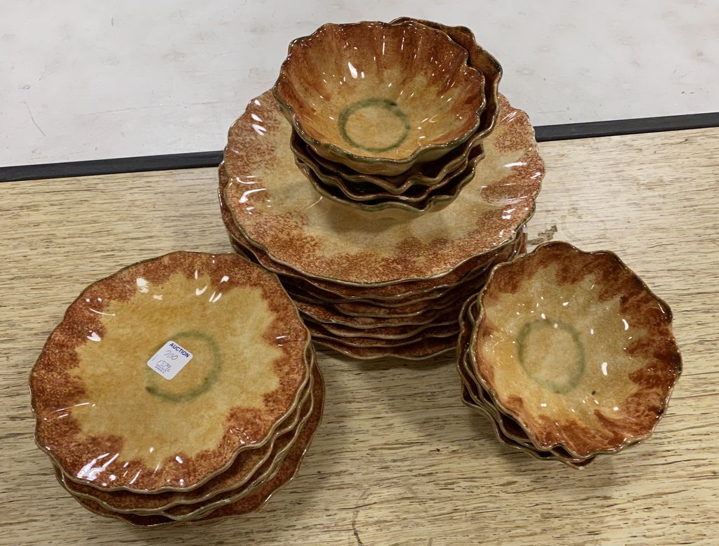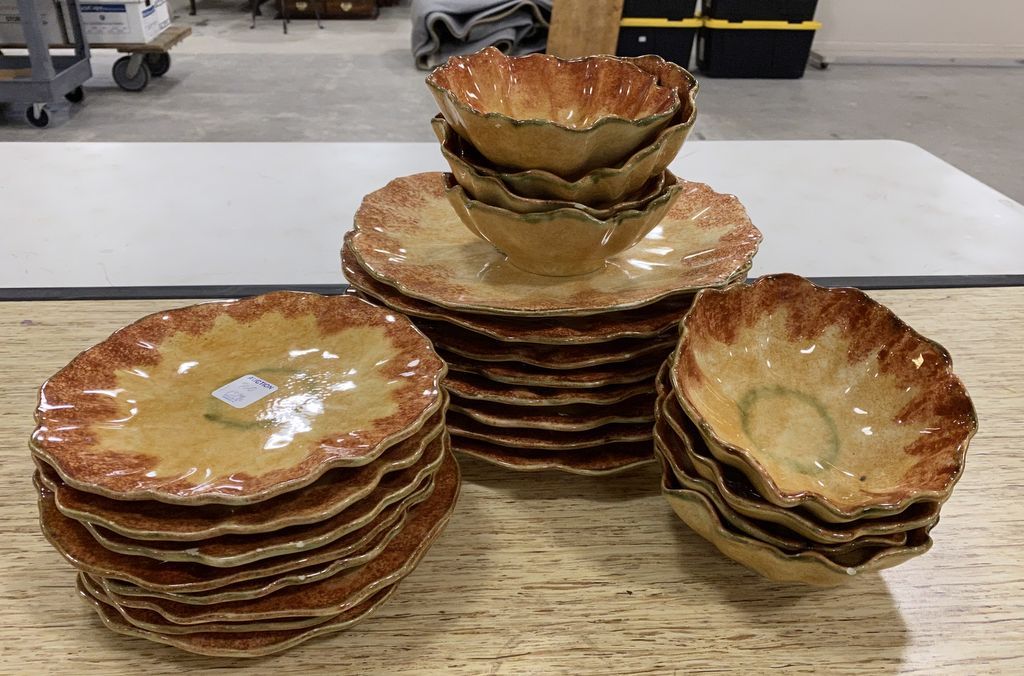 Italy Vietri Stoneware Pottery, 8 dinner plates, 8 bowls, 8 salad plates, several have rim chips. Italy Vietri Stoneware Pottery, 8 dinner plates, 8 bowls, 8 salad plates, several have rim chips.