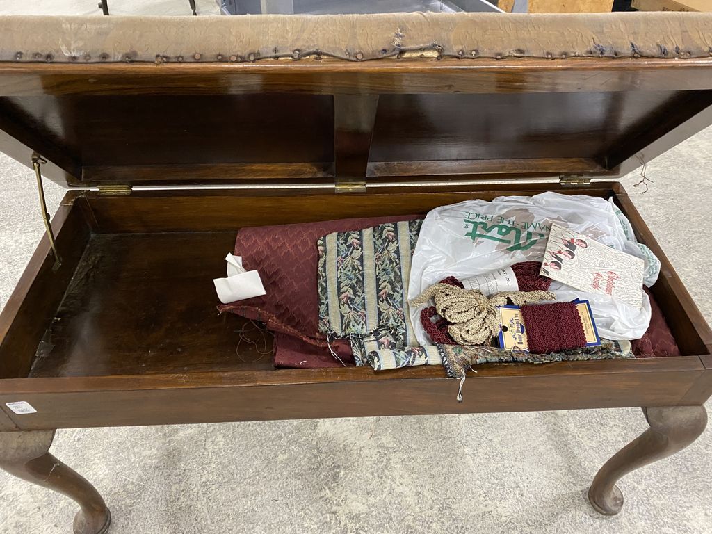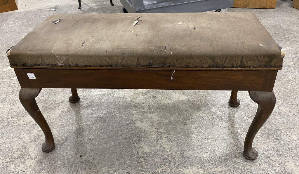 Antique Queen Ann Piano Bench, mahogany, worn upholstered seat, lift top storage, 20"h., 36"w. Antique Queen Ann Piano Bench, mahogany, worn upholstered seat, lift top storage, 20"h., 36"w.