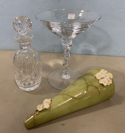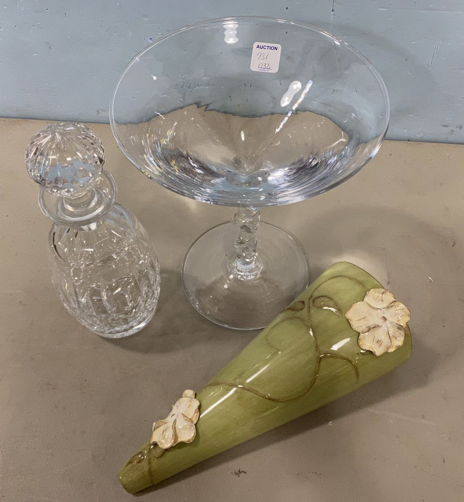 731 Giant Footed Cosmopolitan Glass Compote, Waterford Style Decanter and Wall Pottery