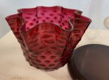 Antique Reproduction Wall Sconce light fixture, red crimped glass shade, with hurricane shade, 23"h. Antique Reproduction Wall Sconce light fixture, red crimped glass shade, with hurricane shade, 23"h.