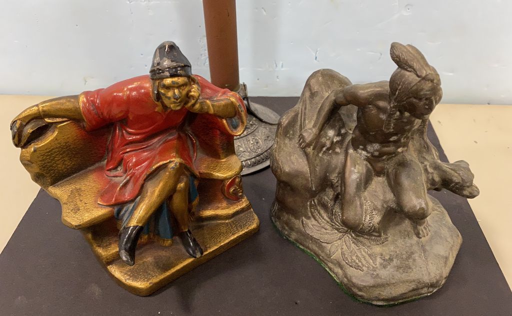 Two Vintage Metal Bookends, Native American, and Persian Man, has age wear, and Antique Candle Stick 10"h. Two Vintage Metal Bookends, Native American, and Persian Man, has age wear, and Antique Candle Stick 10"h.