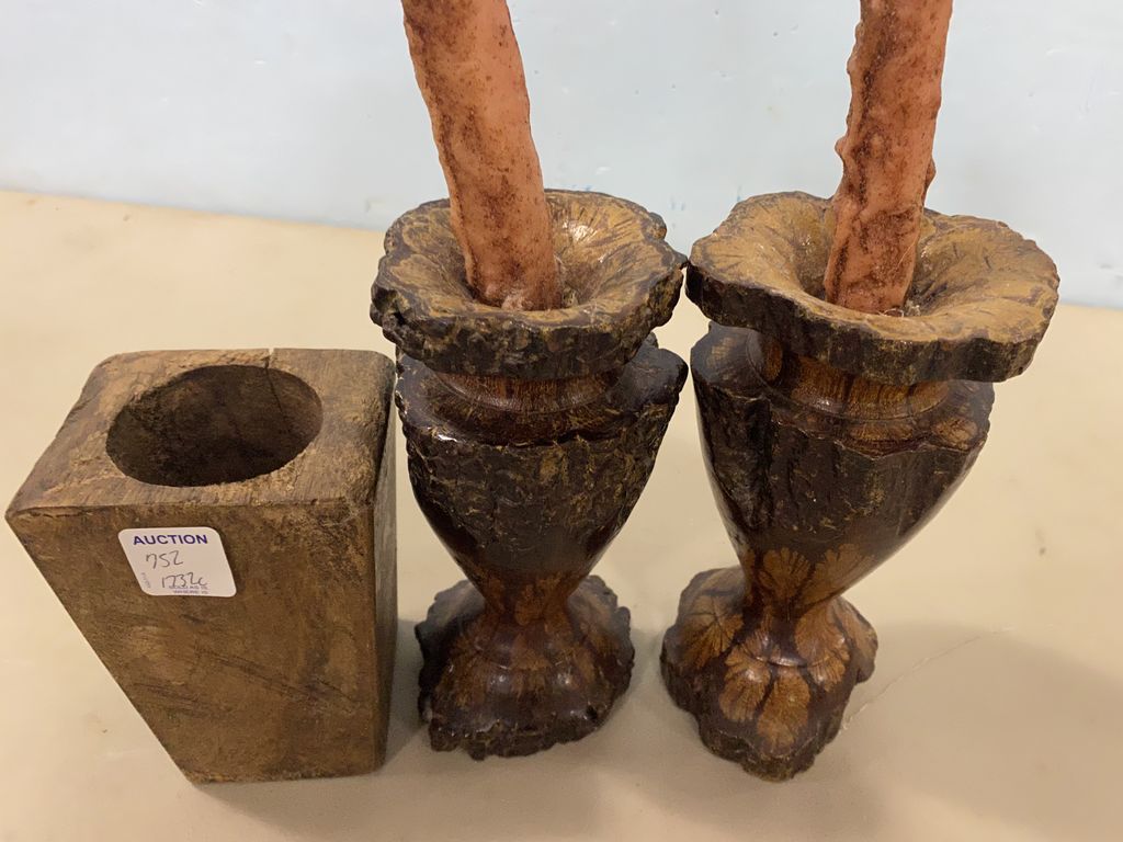 Pair of wood carved candle holder, 7"h., and primitive style wood candle holder. Pair of wood carved candle holder, 7"h., and primitive style wood candle holder.