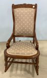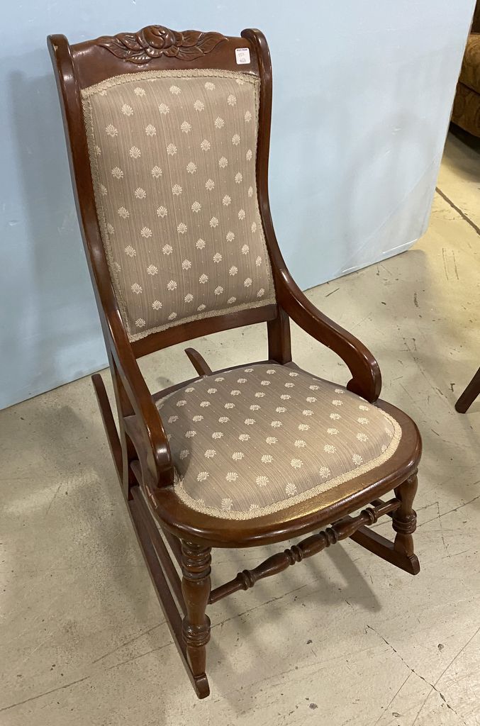 Mahogany Rose Carved Sewing Rocker, clean fabric, 34"h. Mahogany Rose Carved Sewing Rocker, clean fabric, 34"h.
