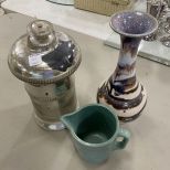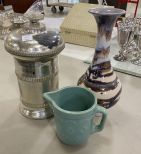 Three Decorative Pitcher, Glass Cannister, and Signed Pottery Vase Beacham Esper, 12"h. Three Decorative Pitcher, Glass Cannister, and Signed Pottery Vase Beacham Esper, 12"h.