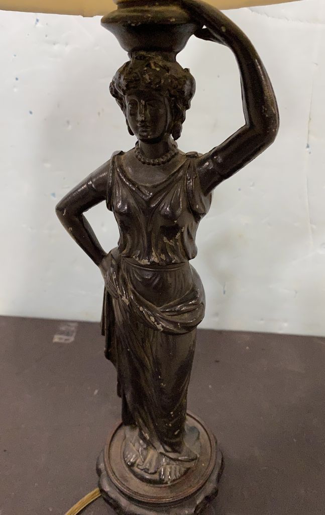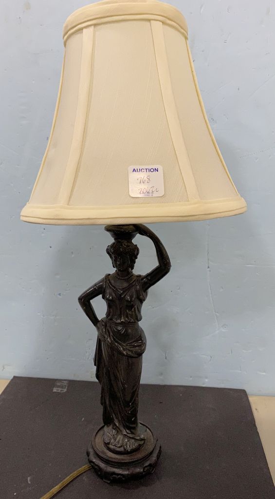 Metal Lady Figural Small Lamp, with shade, patina finish, 18"h. Metal Lady Figural Small Lamp, with shade, patina finish, 18"h.