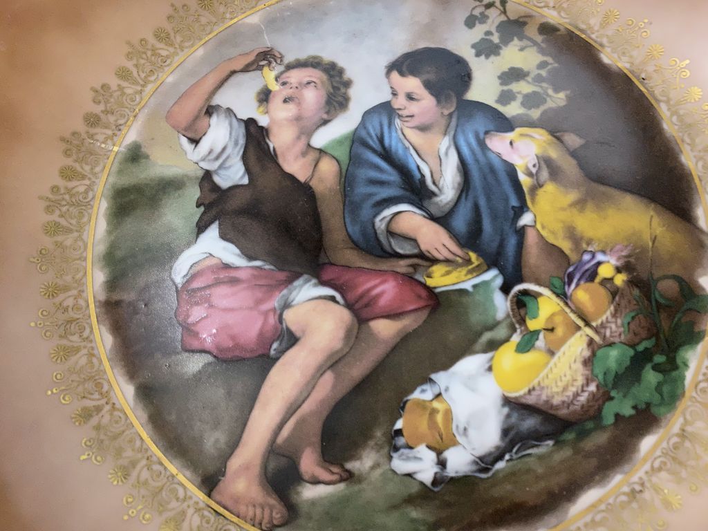 Bavaria Schumann German Hand Painted Charger, porcelain, Family and dog scene, 12"dia. Bavaria Schumann German Hand Painted Charger, porcelain, Family and dog scene, 12"dia.