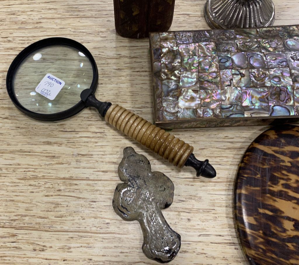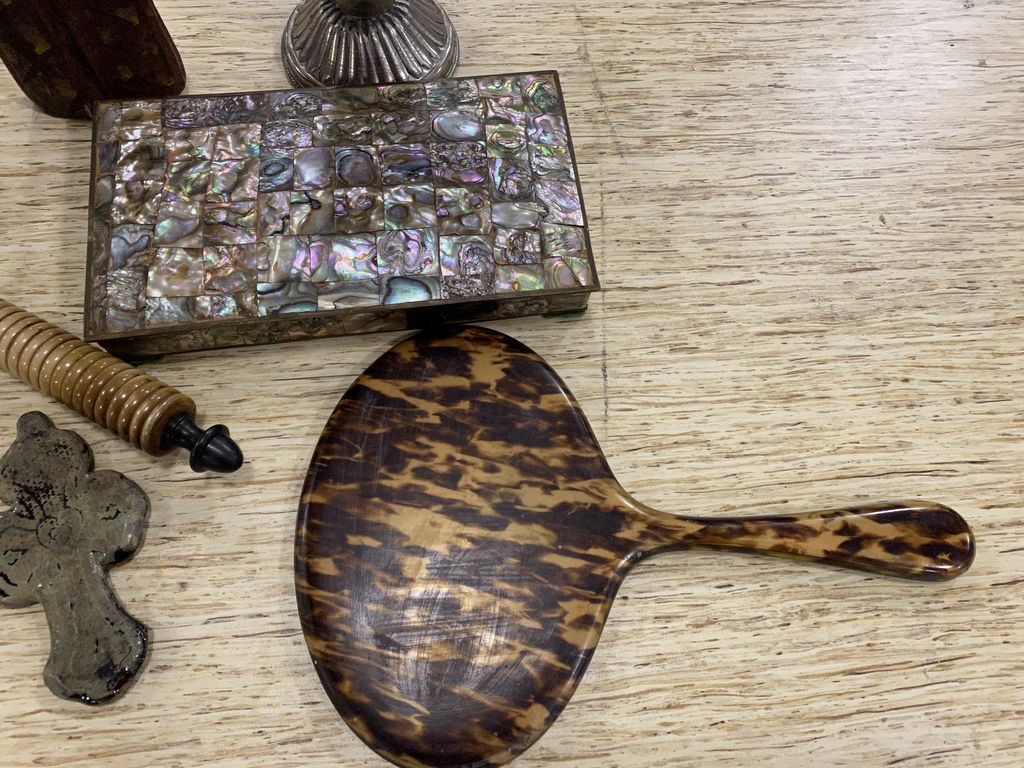 Shell mosaic shell box, wood carved figure, turquoise vanity mirror, pottery cross signed, Two's Company vase. Shell mosaic shell box, wood carved figure, turquoise vanity mirror, pottery cross signed, Two's Company vase.