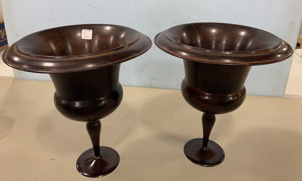 Pair of modern metal vases, Three Hands Corp, patina color, 14"h. Pair of modern metal vases, Three Hands Corp, patina color, 14"h.