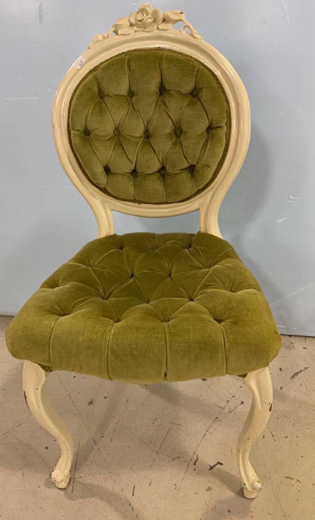 White Painted French Style Side Chair, green upholstery, button tufted, hand painted, 38"h. White Painted French Style Side Chair, green upholstery, button tufted, hand painted, 38"h.