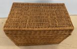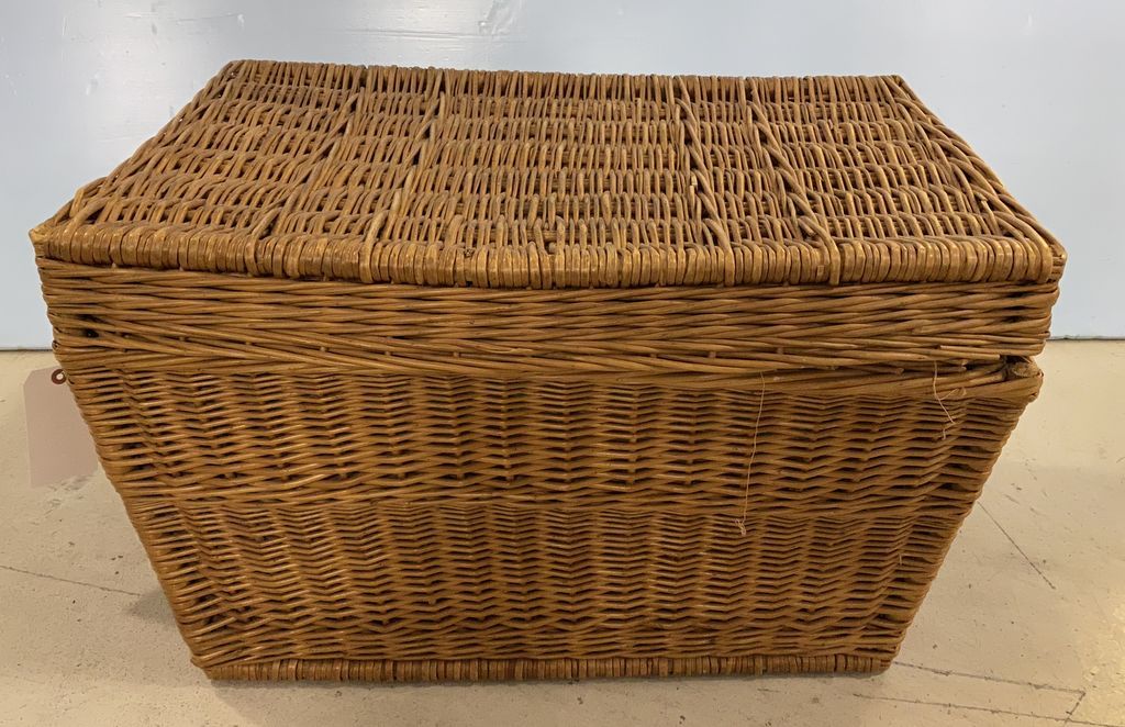 Large Woven Basket Hamper, lift top lid, handled, has wear,17"h., 27"w. Large Woven Basket Hamper, lift top lid, handled, has wear,17"h., 27"w.