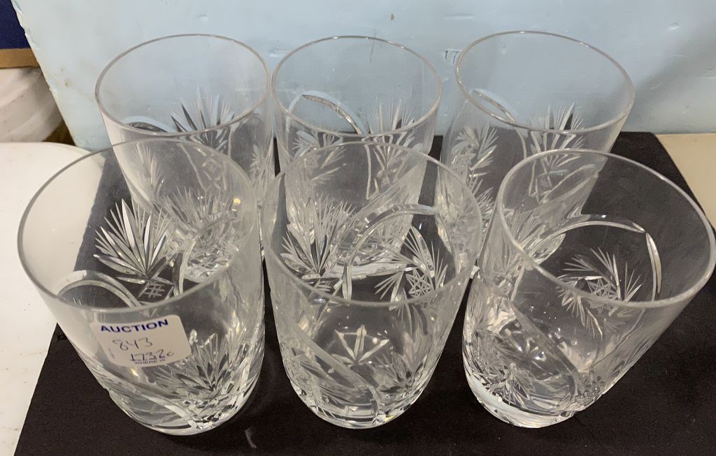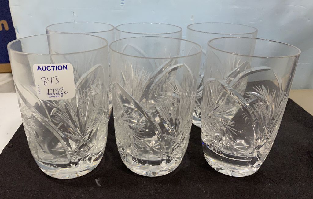 Six Etched Hobstar Glasses, vintage, 4 1/2"h., good condition. Six Etched Hobstar Glasses, vintage, 4 1/2"h., good condition.