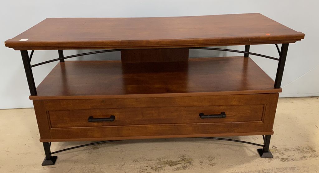Modern Tv Stand, open front, single drawer, pressed wood with metal frame, 23"h., 43"w., 17"d. Modern Tv Stand, open front, single drawer, pressed wood with metal frame, 23"h., 43"w., 17"d.