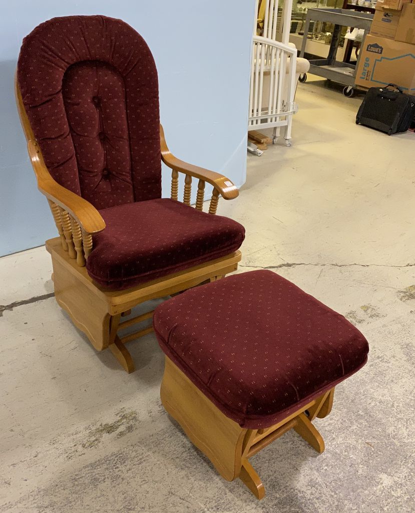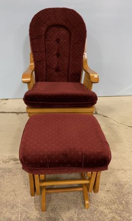 Oak Platform Rocker and Ottoman, red cushion, good condition. Oak Platform Rocker and Ottoman, red cushion, good condition.