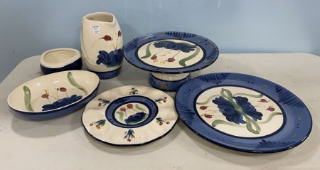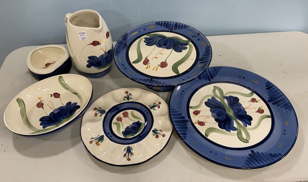 Group of Gail Pittman Pottery, 14" Charger, cake stand, egg tray, water pitcher, heart bowl, oval dish, hand painted, good condition. Group of Gail Pittman Pottery, 14" Charger, cake stand, egg tray, water pitcher, heart bowl, oval dish, hand painted, good condition.
