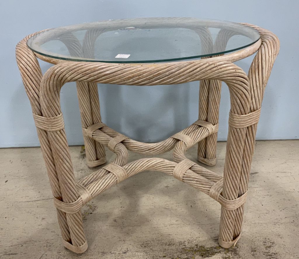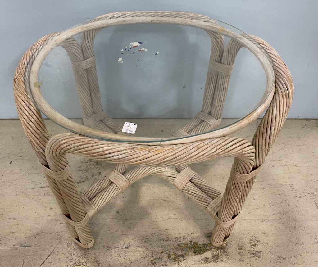 White Wicker Oval Side Table, glass top, age wear, 22"h., 25"w. White Wicker Oval Side Table, glass top, age wear, 22"h., 25"w.