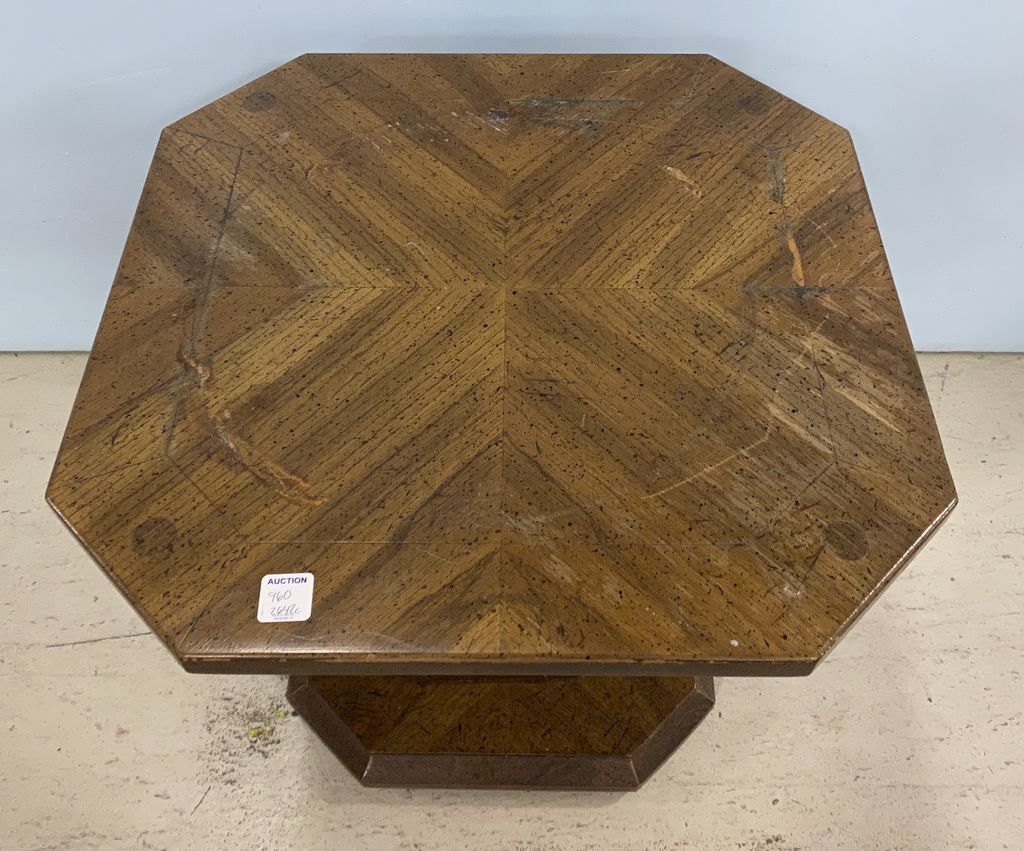 1970's-80's Oak Finish Pedestal Stand, Polygon top, has ring mark, 17"h., 19"w. 1970's-80's Oak Finish Pedestal Stand, Polygon top, has ring mark, 17"h., 19"w.
