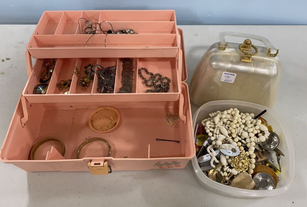 Group of Costume Jewelry, Tackle box with some jewelry, container with assorted costume jewelry, purse. Group of Costume Jewelry, Tackle box with some jewelry, container with assorted costume jewelry, purse.