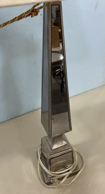 Contemporary Mirrored Table Lamp, silver color, shade, 32"h. one mirror panel has crack. Contemporary Mirrored Table Lamp, silver color, shade, 32"h. one mirror panel has crack.