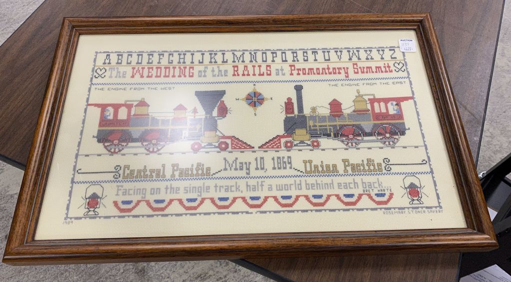 Wedding of the Rails at Promontory Summit Needle Point Sampler, Rosemary Stoner Savery, framed, 23"h., 15"w. Wedding of the Rails at Promontory Summit Needle Point Sampler, Rosemary Stoner Savery, framed, 23"h., 15"w.
