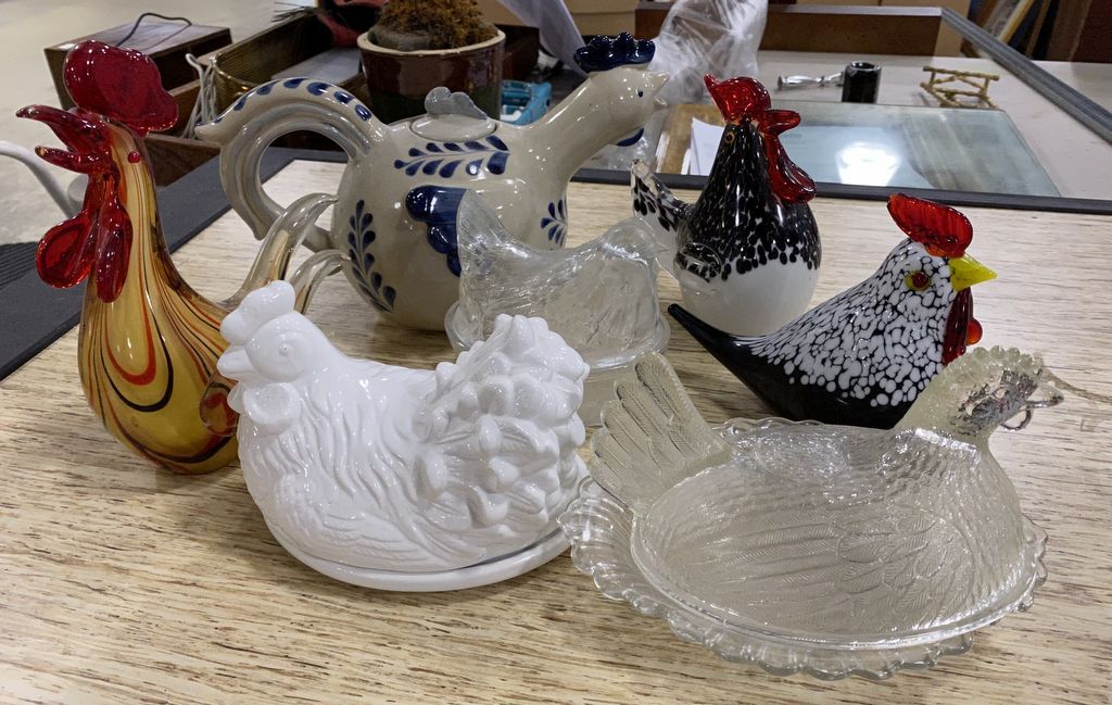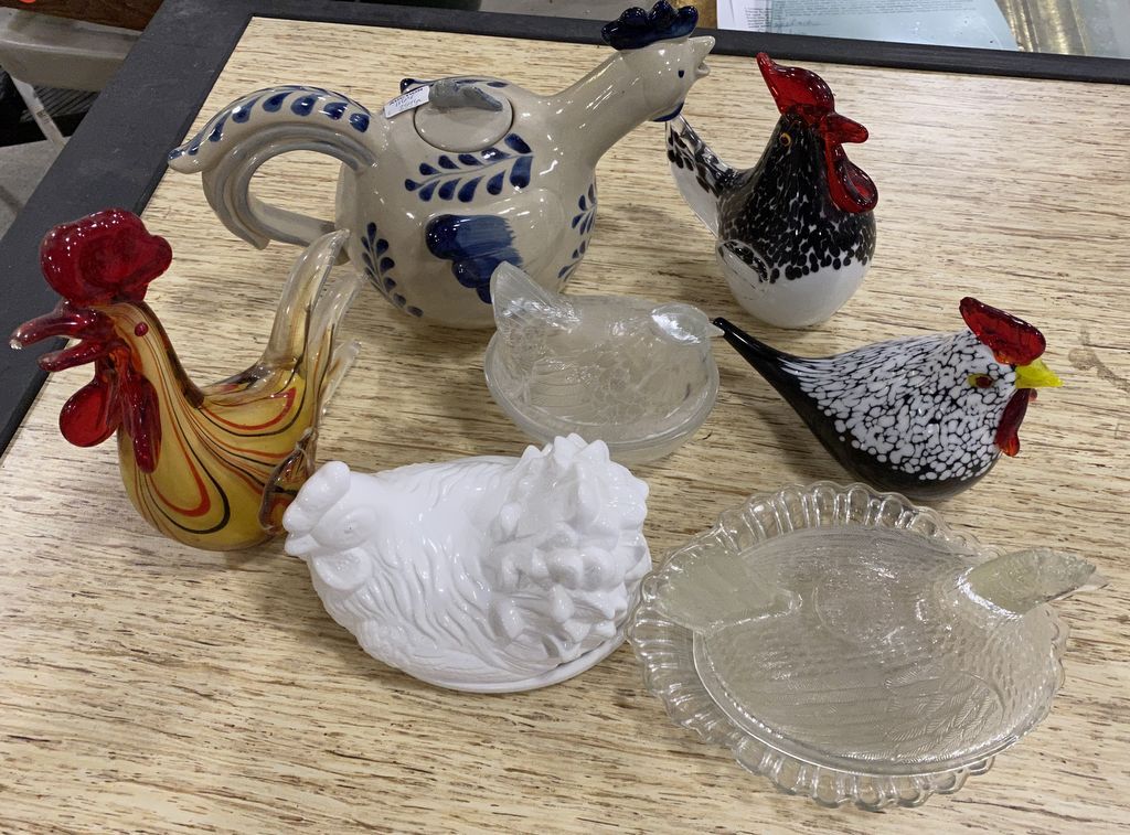 Group of Glass and Pottery Roosters, stoneware rooster, art glass roosters, depression glass rooster, white ceramic rooster. Group of Glass and Pottery Roosters, stoneware rooster, art glass roosters, depression glass rooster, white ceramic rooster.