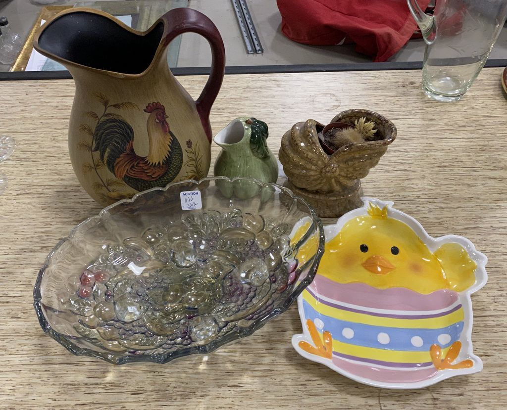 Ceramic rooster pitcher 10"h., ceramic pear pitcher, pottery shell vase, baby duck plate, pressed glass center bowl. Ceramic rooster pitcher 10"h., ceramic pear pitcher, pottery shell vase, baby duck plate, pressed glass center bowl.
