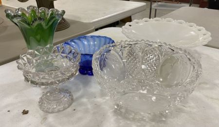 Collection of Art and Clear Glassware, art glass vase, blue glass bowl, pressed glass compote, footed bowl, milk glass compote. Collection of Art and Clear Glassware, art glass vase, blue glass bowl, pressed glass compote, footed bowl, milk glass compote.