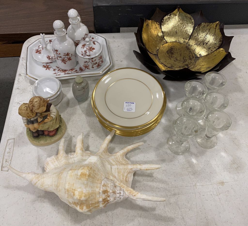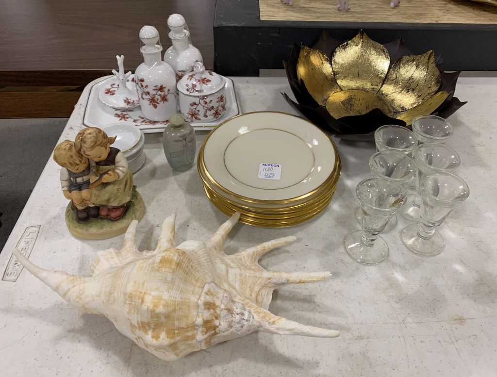 Limoge canisters, tray, oriental snuff bottle, shell, 6 glass cups, gold gilt flower bowl, Himmel figurine, 7 Lenox Eternal plates. Limoge canisters, tray, oriental snuff bottle, shell, 6 glass cups, gold gilt flower bowl, Himmel figurine, 7 Lenox Eternal plates.