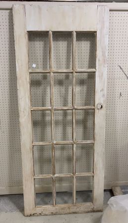 Used Wood Door with glass, needs work, 79"h., 32"w. Used Wood Door with glass, needs work, 79"h., 32"w.