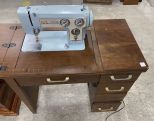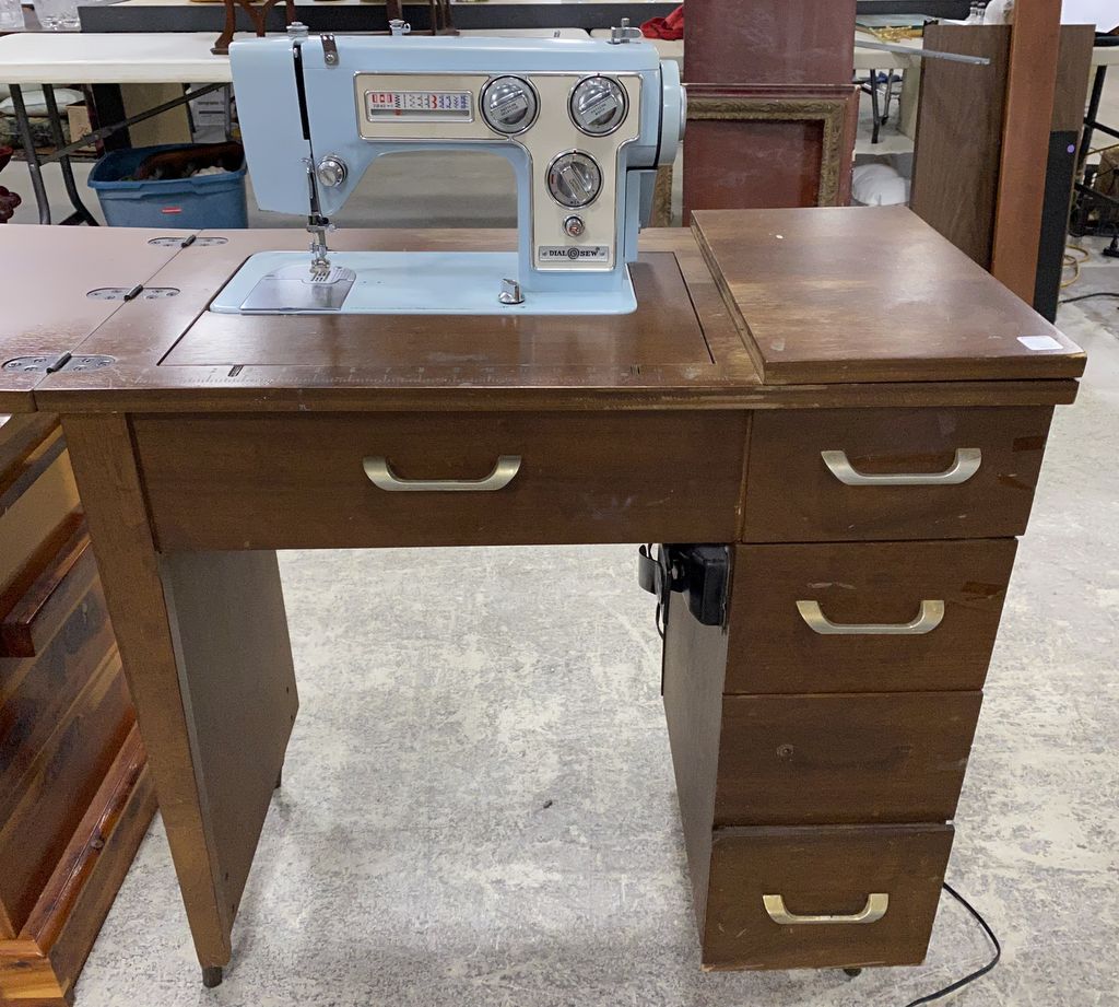 Cherry Sewing Machine Cabinet with Machine, Dial Sew machine, four drawers, has wear, 31"h., 30"w. Cherry Sewing Machine Cabinet with Machine, Dial Sew machine, four drawers, has wear, 31"h., 30"w.