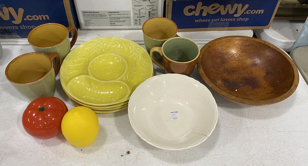 Group of Stoneware and Serving Pieces, four stoneware chip & dip plates, wood serving bowl, four ceramic mugs, porcelain bowl. Group of Stoneware and Serving Pieces, four stoneware chip & dip plates, wood serving bowl, four ceramic mugs, porcelain bowl.