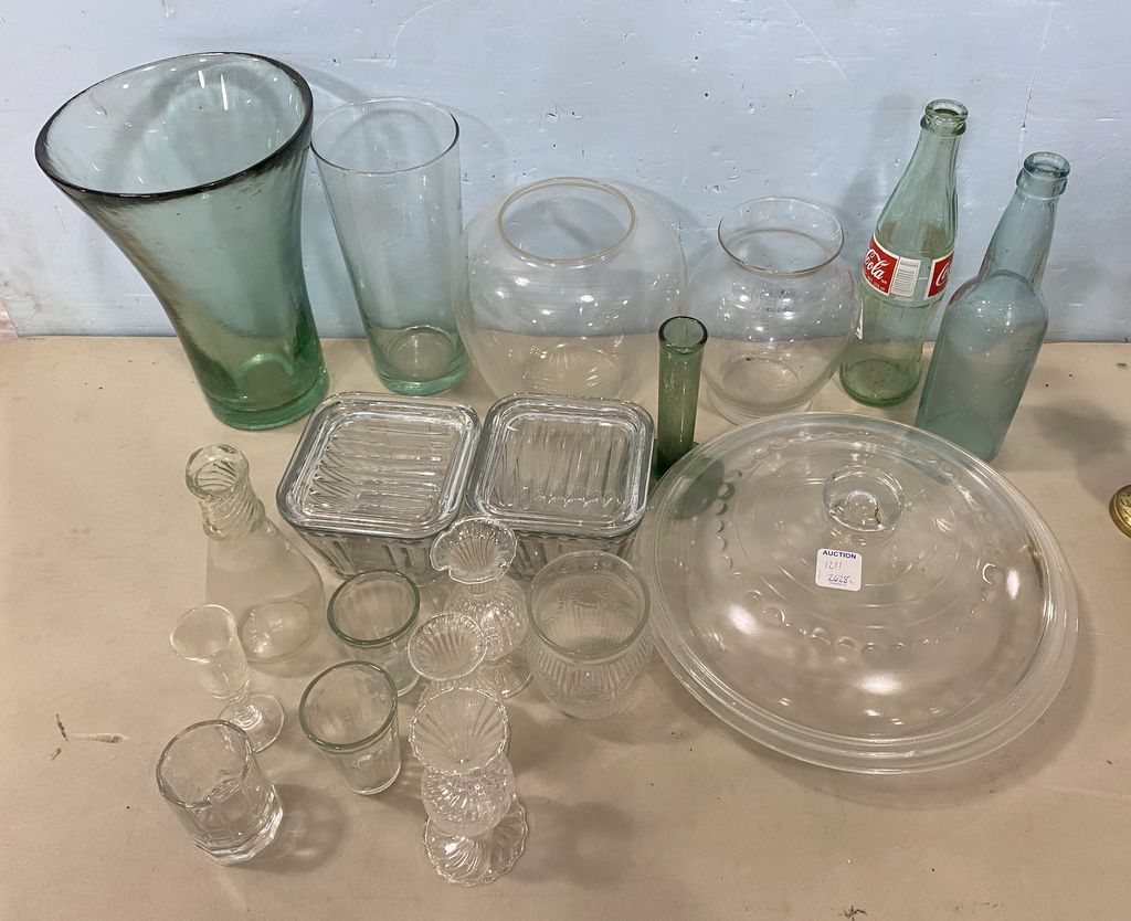Group of Glassware Pieces, flower vases, bud vases, covered dish, covered dish, Coca Cola bottle. Group of Glassware Pieces, flower vases, bud vases, covered dish, covered dish, Coca Cola bottle.