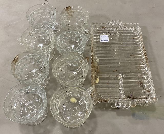 8 White Hall Cube Cups and Two Glass Luncheon Trays, needs cleaning. 8 White Hall Cube Cups and Two Glass Luncheon Trays, needs cleaning.